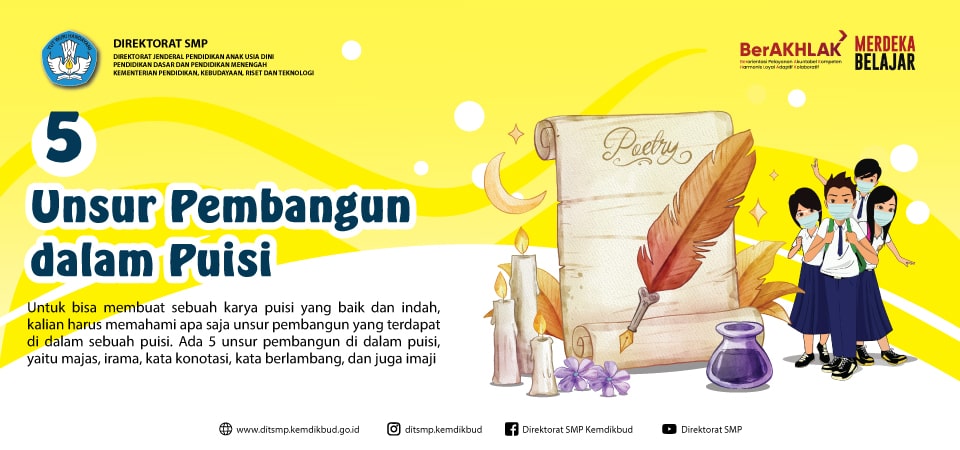 Nah Sobat SMP, untuk bisa membuat sebuah karya puisi yang baik dan indah, kalian harus memahami apa saja unsur pembangun yang terdapat di dalam sebuah puisi. Ada 5 unsur pembangun di dalam puisi, yaitu majas, irama, kata konotasi, kata berlambang, dan juga imaji. Yuk kita bahas satu per satu!