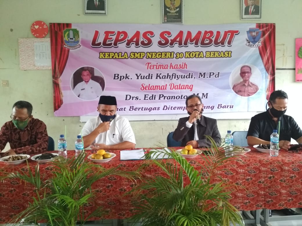 SMP Negeri 30 Kota Bekasi pada tanggal 23 Oktober 2020 hari Jumat jam 13.00, mengadakan acara lepas sambut atau serah terima kepala sekolah dari Bapak Yudi Kahfiyudi, M.Pd kepada bapak Drs. Edi Pranoto, MM.